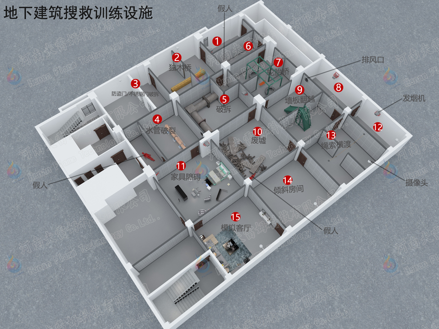 模擬地下倉庫、地下商場(chǎng)、地下車庫等火災(zāi),開展火災(zāi)撲救、搜救人員的訓(xùn)練。性能符合《消防培訓(xùn)基地訓(xùn)練設(shè)施建設(shè)標(biāo)準(zhǔn)》GA/T623規(guī)定。